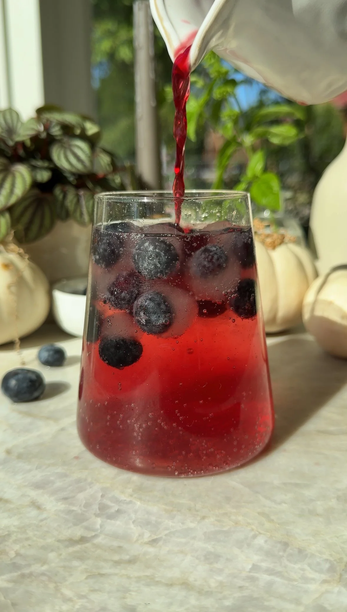A mix of blueberries, coconut water, sea salt, pomegranate, and sparkling water may look like a retinal migraine, but may actually give some relief and hydration - packed with natural electrolytes and antioxidants. This is a fun alternative to sodas for a party!